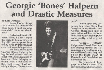 Georgie 'Bones" Halpern and Drastic Measures are playing around the Toronto area and for all you dancers and Blues lovers, they will be at the Black Swan at Danforth and Broadway on November 3rd [1994].